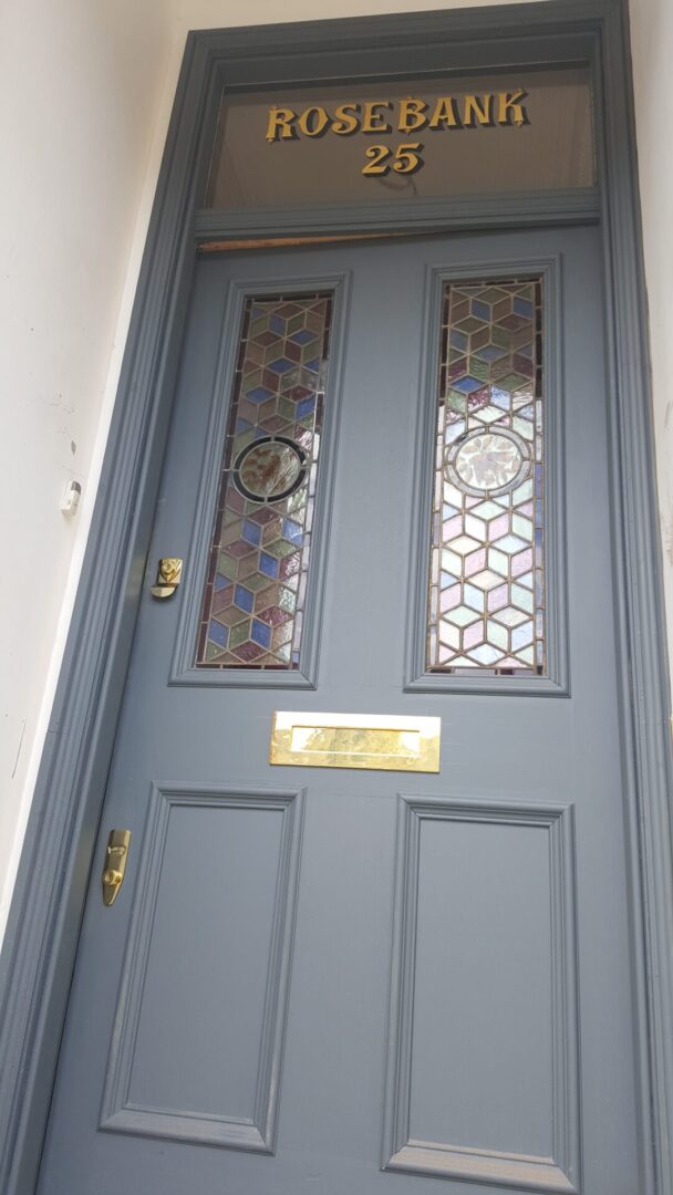 Gold Leaf signwriting on a transom window for a house sign in Hampstead