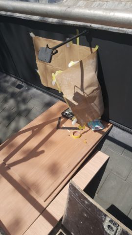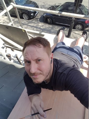 The clients actually overlooked that they had a perminant awning made from angled timber & covered in slates. So on arrival, there was a glaring issue, which was access to the fascia from a ladder! Luckily the contractors who were painting the fascia boards & surrounding walls hadn’t finished their internal work & still had their mini tower. So this got assembled & a makeshift platform was screwed to the awning from the mini tower.